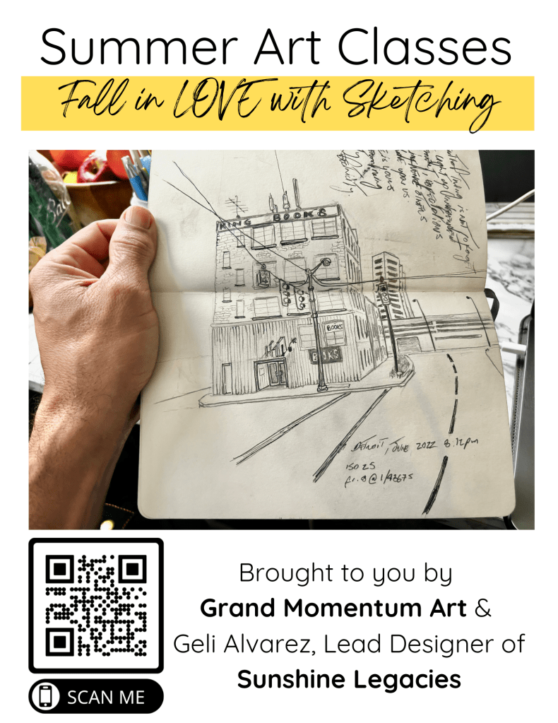 Geli Alvarez, the Lead Designer for Sunshine Legacies, will be working with only 10 students this summer per class to help each one fall in love with sketching and improve their ability to see art all around them and put it on paper.